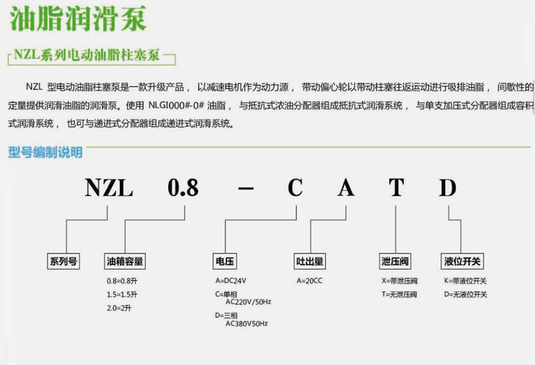 產(chǎn)品說明:nzl系列電動油脂潤滑泵是一種柱塞油脂泵,適用于潤滑脂單線抵抗式潤滑系統(tǒng)或遞進(jìn)式潤滑系統(tǒng)。
